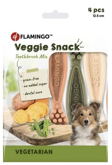 Flamingo Veggie gryzaki dla psa Gryzaki w kształcie szczoteczki Idealne jako nagroda lub przekąska Długość 12,5 cm Skład: skrobia z batatów, mąka grochowa, gliceryna, węglan wapnia, celuloza w...
