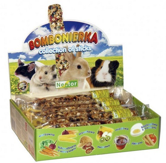 Bombonierka - zestaw kolb Bombonierka dla gryzoni i królików to zestaw 12 kolb w 7 smakach: biszkoptowo-owocowy, jajeczny, miodowy, owocowy, orzechowy, kukurydziano-warzywny, warzywny. Kolba to...
