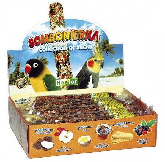 Bombonierka - zestaw kolb Bombonierka dla średnich papug to zestaw 12 kolb w 6 smakach: biszkoptowy, jajeczny, miodowy, owocowy, leśny, tropikalny Kolba to wspaniały przysmak będący jednocześnie...