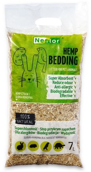 Nestor Ściółka konopna dla zwierząt domowych Ściółka ze słomy konopnej jest superchłonna, bardzo wydajna i odpowiednia dla alergików, rzadko powoduje uczulenia. Luźna struktura zapewnia stałą...