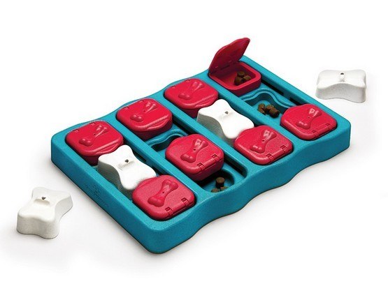 Węsząc i pomagając sobie łapą lub pyszczkiem pies natrafi na trzy rodzaje skrytek - będzie musiał zdjąć, otworzyć lub przesunąć elementy skrywające łakocie.