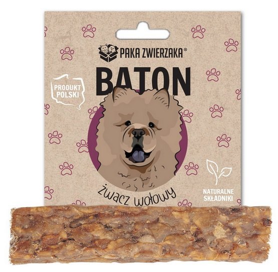 PAKA ZWIERZAKA Baton Żwacz wołowy 12 cm Baton wykonany ręcznie, pozbawiony klejów i barwników. Stworzony tylko z naturalnych składników najwyższej jakości. Bezpieczny dla dziąseł psa, nie zawiera...
