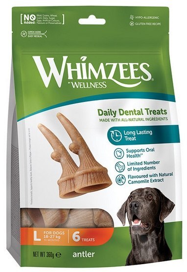 Whimzees Wege Róg L GRYZAKI DENTYSTYCZNE DLA WSZYSTKICH PSÓW W WIEKU POWYŻEJ 9 MIESIĘCY Higiena jamy ustnej u psów jest tak samo ważna, jak u ludzi, a gryzaki dentystyczne WHIMZEES ułatwiają psom...